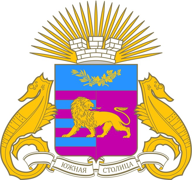 Описание: Большой герб города представляет собой «четырёхугольный, с закруглёнными нижними углами, заострённый в оконечности, рассечённый геральдический (русский) щит. Правое поле пересечено 6 раз четырьмя пурпурными и тремя лазоревыми полосами. Левое поле пурпурное. В сердце щита – наложенный, стоящий, золотой, обернувшийся лев. В лазоревой главе положены скрещённые золотые ветви лавра и винограда. Щит увенчан золотой трёхглавой «башней достоинства» и золотой пальмовой ветвью. Щитодержатели – золотые морские коньки, удерживающие хвостами под щитом серебряную девизную ленту с надписью золотыми буквами «ЮЖНАЯ СТОЛИЦА»