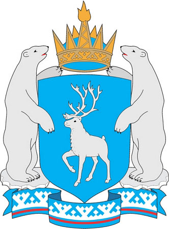Герб Ямало-Ненецкого автономного округа. В лазоревом (сине-голубом) поле щита — белый (серебряный) северный олень. Щит увенчан традиционной золотой региональной короной с золотым пламенем на среднем зубце. Щит поддерживают серебряные полярные медведи, стоящие на серебряных заснеженных льдинах. На лазоревой ленте воспроизведен орнамент, соответствующий бело-сине-красному рисунку флага округа.