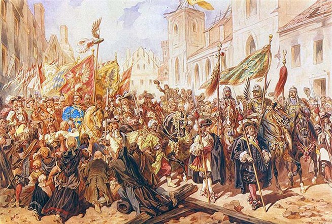 Польский король Ян III Собеский выступает в поход на защиту Вены в 1683. Картина Юлиуса Козака 1883.