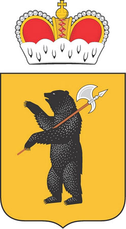 Герб Ярославской области, принятый 27 февраля 2001 года. В золотом щите — черный медведь, держащий левой лапой на левом плече серебряную секиру с червленым (красным) древком. Щит венчает ярославская княжеская шапка, соответствующая описанию 1730 года.