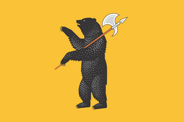 Флаг Ярославской области был принят 27 февраля 2001 года. На полотнище желтого цвета изображение черного медведя, держащего левой лапой на левом плече серебряную секиру с червленым (красным) древком.