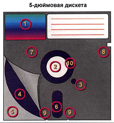Устройство 5.25 дискеты: 1. Заводская этикета, 2. Отверстие для шпинделя, 3. Индексно-секторное отверстие, 4. Магнитный диск, 5. Нетканый материал, 6. Отверстия для головки чтения-записи, 7. Корпус дискеты, 8. Вырез блокировки записи, 9. Освобождающие выемки.