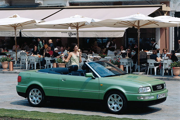 Audi Cabriolet (вид сбоку) на фоне кафе