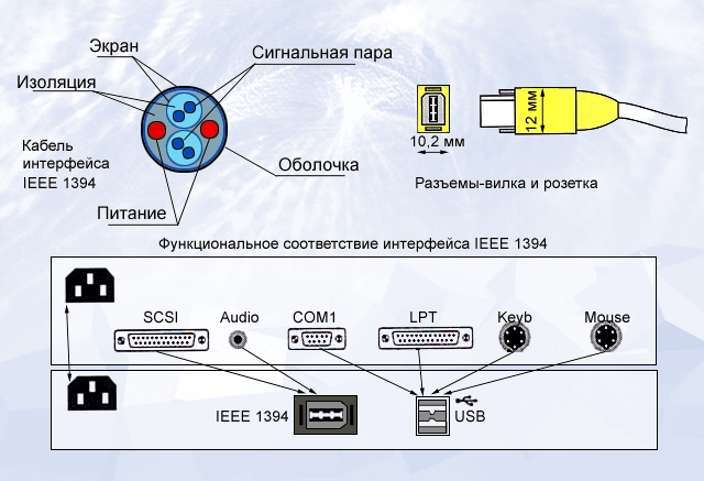 Схема разъема интерфейса FireWire и функциональное соответствие интерфейса IEEE 1394.