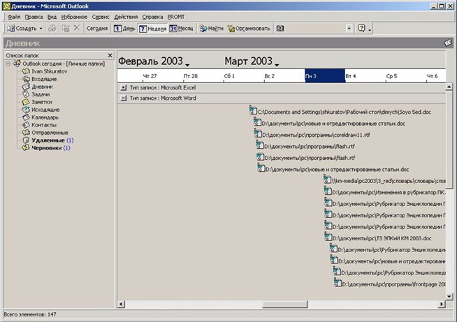 Функция «дневник» в Microsoft Outlook 2000.