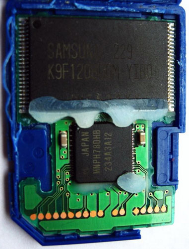 Внутреннее устройство флэш-карточки SecureDigital емкостью 64 Мб производства Panasonic. Слева — чип NAND-памяти, справа — микроконтроллер.
