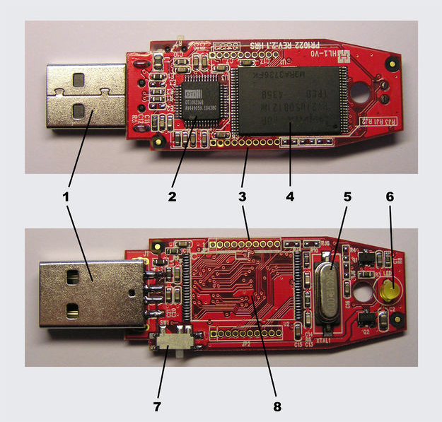 USB-флэш-память. Внутреннее устройство. 1 — USB-разъем (вставляется в USB-разъем компьютера); 2 — USB-контроллер, обеспечивает доступ к памяти, сообщает операционной системе необходимые сведения; 3 — тестовые контакты (с помощью них в процессе производства тестируется работоспособность памяти); 4 — чип NAND-памяти; 5 — кварцевый осциллятор, генерирующий тактовую частоту (12 МГц); 6 — световой индикатор (горит, если чип работает); 7 — кнопка защита от записи (опционально); 8 — место для второго чипа памяти.