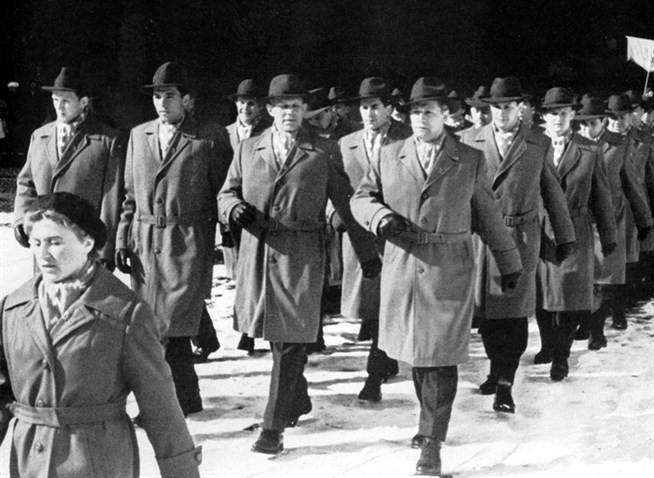 Команда СССР на торжественном открытии Белой Олимпиады в Скво-Вэлли.