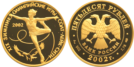 Памятная золотая монета банка России, выпущенная к XIX Олимпийским играм в Солт-Лейк-Сити в 2002 году. Номинал - 50 рублей.