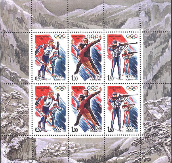 Блок почтовых марок России. XVIII Зимние Олимпийские игры в Нагано. 1998 год. Художник: Б.Илюхин. Издатель: ИТЦ «Марка»