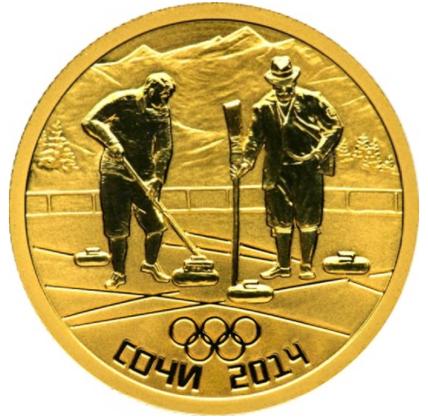 Памятная монета Банка России «Кёрлинг», выпущенная в честь зимних Олимпийских игр в Сочи 2014-го года. Золото, номинал - 50 рублей. Тираж до 20, 0 тыс. штук. 2011 год.