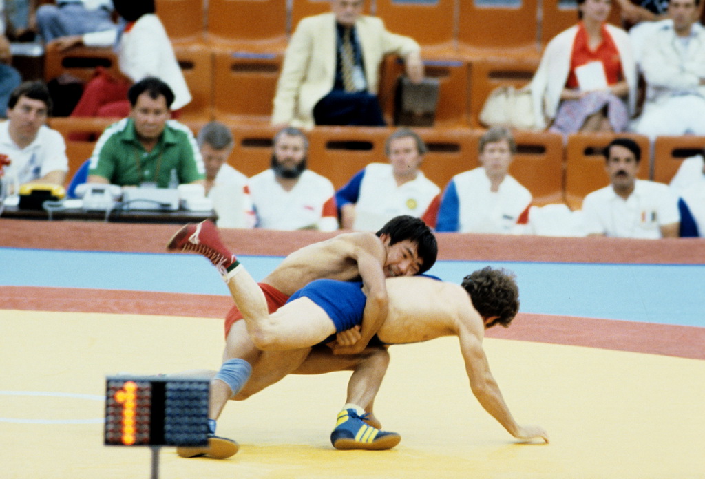 Советский спортсмен Жаксылык Ушкемпиров (сверху) и болгарский спортсмен Павел Кристов в финале соревнования по классической борьбе (до 48 кг). XXII летние Олимпийские игры, спорткомплекс ЦСКА. Москва. 1980 год. Фото: Владимир Родионов, архив РИА Новости