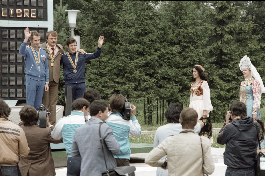 Призеры XXII летних Олимпийских игр в Москве по произвольной стрельбе из пистолета на 50 метров (слева направо): Харальд Фольмар, Александр Мелентьев на первом месте и Любчо Дьяков на третьем месте. 1980 год. Фото: Юрий Сомов, архив РИА Новости