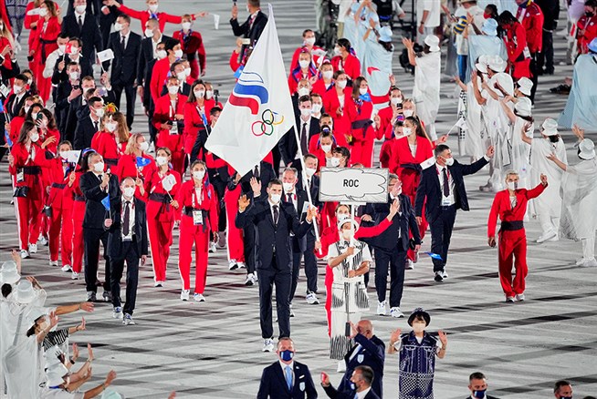Сборная России пож флагом ОКР во время парада спортсменов. Национальный стадион в Токио 23 июля 2021 г. Фото: Michael Kappeler / Getty Images